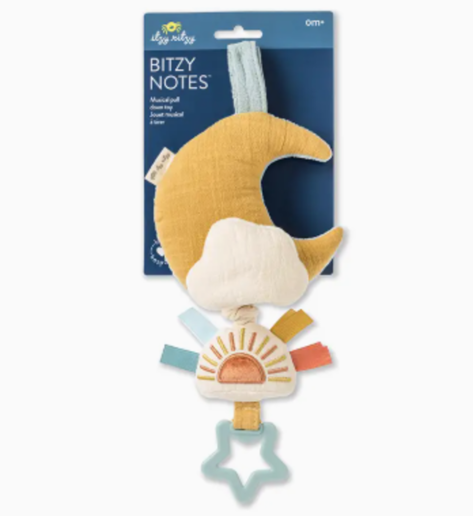 A Lullaby to Go! Create calming vibes wherever you go with our Bitzy Notes™ music toy. Made of soft natural cotton fabric, it easily attaches to your car seat or stroller and plays a soothing melody with a simple pull. Cue the music, it’s time to chill! - Pull down music box plays a soothing melody - Encourages reaching, grabbing, and cause & effect - Includes a custom ring that is easy for baby to grasp - Soft hook & loop attachment makes it easy to attach to car seat or stroller - Lullaby plays for approximately 60 seconds - 0m+