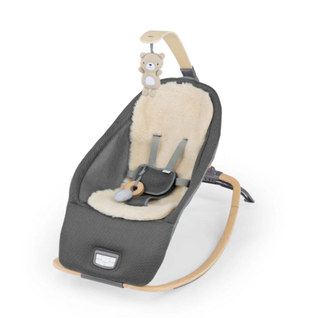 The right body temperature is essential to the happiness of your little one. Ingenuity's innovative Every Season™ Rocking Seat made with Air Flow technology is the simple, all-in-one solution to keeping baby consistently comfortable in any environment. The extra cozy lamsbwool is 100% natural and sourced from Australia. Plus, you'll get some extra use with this rocking seat as it converts to a stationary seat to grow from baby to toddler. A detachable toy bar, made with wood from a sustainable forest, includes a removable soft plush Nate the Bear character toy and wooden ring toy on a T-strap. The seat plays soft music and comforting sounds along with gentle vibration to soothe baby's fussy moments; sound and vibration require 3 C alkaline batteries (not included). Our innovative design helps you fold the rocker flat for easy storage and transport. The seat is made for babies ages 0-30 months or up to 40 pounds, whichever comes first.